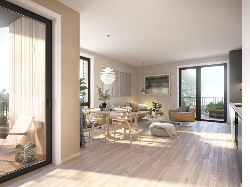 Mange av dere som vurderer Brynehagen, skal kanskje flytte fra enebolig med god terrasse. Det har vi tenkt på i planleggingen, og derfor er det fokusert ekstra på å utnytte tomtens muligheter til å lage et bygg med best mulige terrasser og balkonger. Et av resultatene i så måte, er at flertallet får sol inn fra både sør og vest, og at de tre minste på 52 m2 får to balkonger.
