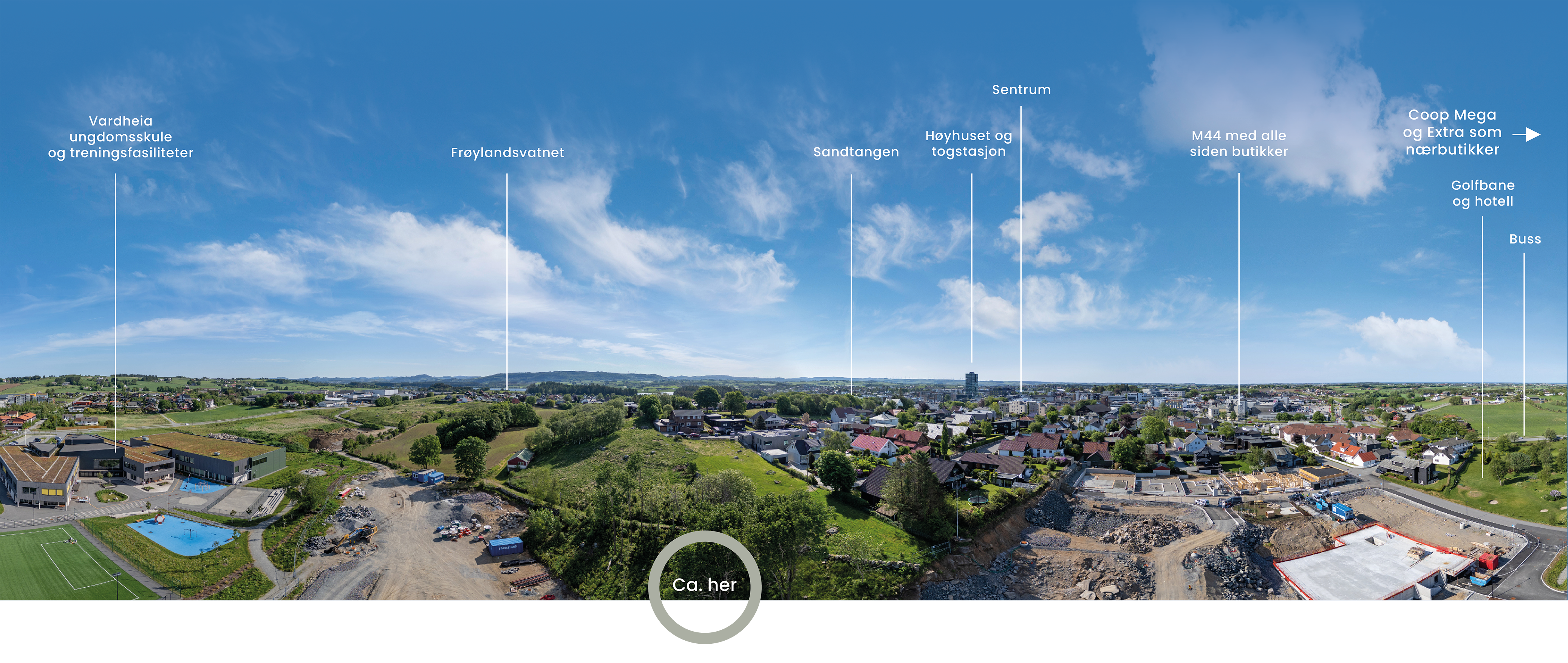 Oversiktsbildet (180 grader) ble tatt i juni, og viser omgivelsene hvor Brynehagen skal oppføres. Brynehagen blir liggende mot Bryne sentrum, ved et flott grøndrag, og omgitt av turstier litt på kryss og tvers.